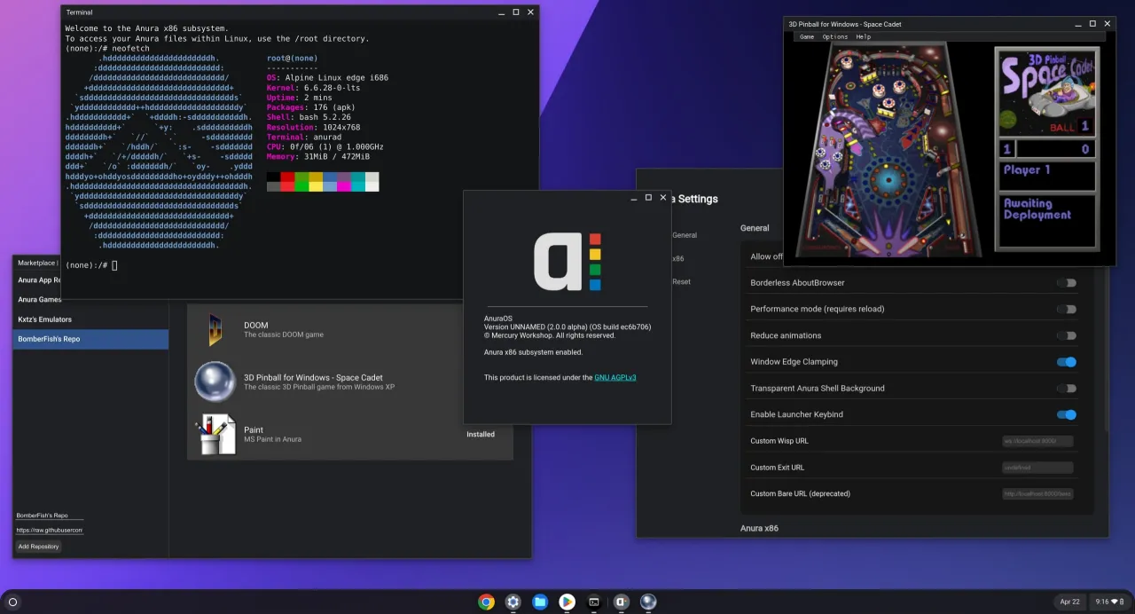 AnuraOS is the next-gen webOS and development environment with full Linux emulation. That is to say, a full desktop environment running locally in your browser, with x86 Linux emulation. I've been making various contributions since March 2024, most of which reworked various parts of the UI. AnuraOS 2.0, which contains my contributions, was released in November 2024.